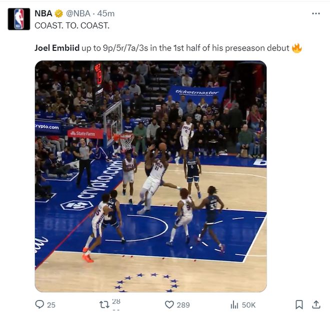 NBA官方全程记录着大帝的复出,开场第二攻就是大帝持球的撤步中距离,那个技术细腻的常规赛MVP还在,恩比德还是那么的厉害,NBA官方写道:时隔237天的第一次跳投得分。