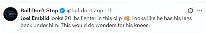 美媒:感觉恩比德减重了20磅,他的双腿变得很有力量,这对于减轻膝盖的压力很有效。